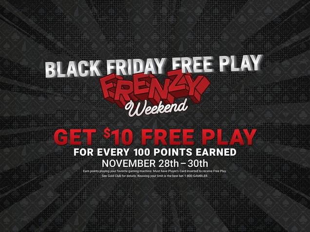 Get $10 Free Play for every 100 points earned playing your favorite gaming machine November 28th - 30th.