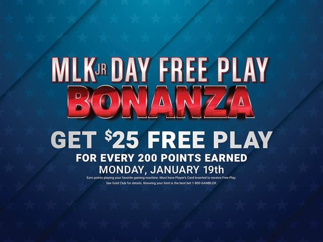 Get $25 Free Play for every 200 points earned playing your favorite gaming machine Monday, January 19th.
