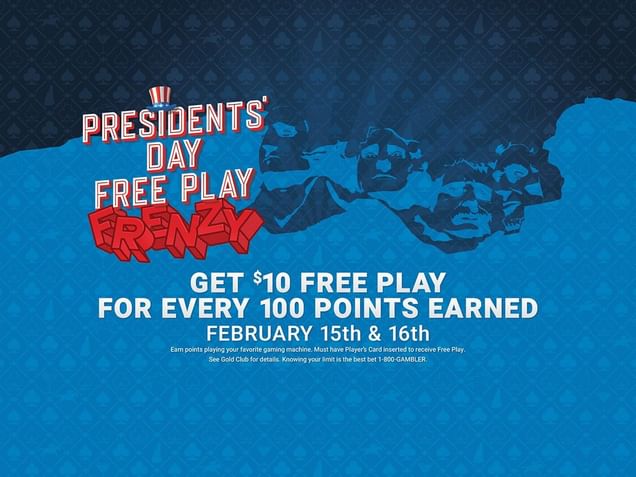Get $10 Free Play for every 100 points earned playing your favorite gaming machine February 15th & 16th.