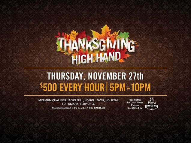 Don't miss the Thanksgiving High Hand on Thursday, November 27th. $500 every hour from 5pm to 10pm.