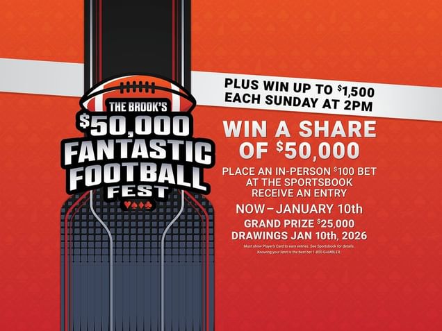 Win your share of $50,000! Place an in-person $100 bet at the sportsbook and receive an entry. PLUS win up to $15,00 each Sunday at 2PM. Sept 1st – Jan 10th.